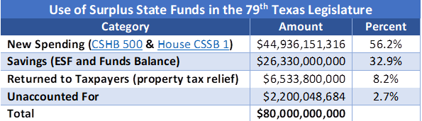 Out of the $80 billion surplus, more than $71 billion, or 89.1%, is dedicated to new spending in this biennium or possible new spending in a future biennium. Only $6.5 billion, or 8.2%, is being returned to taxpayers this session in the form of property tax relief.